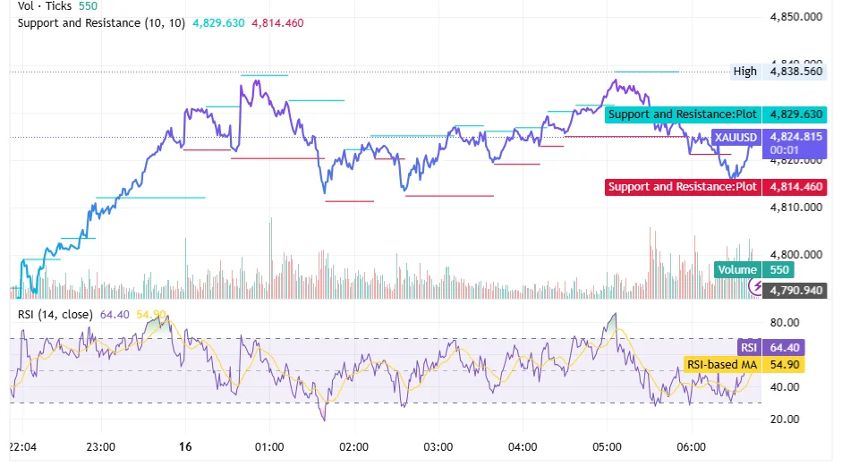 يميل الذهب فنيًا إلى التماسك المائل للإيجابية بعد ارتداد واضح من 4,814.460 دولارًا، مع تداول السعر قرب 4,824.815. وتظهر المقاومة المباشرة عند 4,829.630، ثم 4,838.560 وهي قمة الجلسة الحالية. أما على جانب الزخم، فتظهر قراءة RSI عند 64.40 مقابل متوسط متحرك عند 54.90، وهي قراءة تميل لصالح المشترين، لكنها تقترب من منطقة قد يبدأ معها الصعود في فقدان بعض الراحة إذا لم يحدث اختراق واضح.