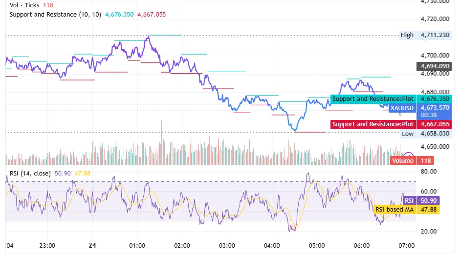 تقول الحركة الفنية إن الذهب ما زال في منطقة دفاعية. حيث أعاد الارتداد من 4,658.030 بعض التوازن اللحظي، لكن السعر لم ينجح بعد في استعادة 4,676.350 ثم 4,694.090، ولذلك لا يمكن التعامل مع الحركة الحالية كتعافٍ كامل.