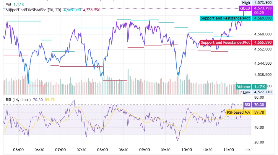 ملخص التحليل الفني: تحرك الذهب خلال الجلسة داخل نطاق صاعد تدريجيًا بعد موجة تذبذب واضحة في النصف الأول من التداولات. نجح السعر في الارتداد من قاع يومي قرب 4,527.210، ثم صعد ليستقر قرب 4,573.793، وهو قريب جدًا من أعلى مستوى ظاهر على الشارت عند 4,573.900. تعني هذه الحركة أن المشترين استعادوا السيطرة في الساعات الأخيرة، خصوصًا مع بقاء السعر أعلى مناطق الدعم اللحظية التي كانت تعيق الصعود سابقًا. |