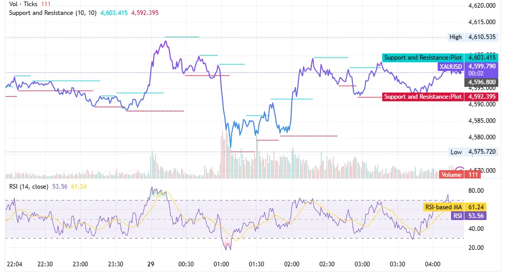 يتحرك الذهب على شارت الدقيقة قرب 4,599.790 دولار، بعد ارتداد واضح من القاع المسجل قرب 4,575.720، لكنه ما زال يواجه مقاومة قصيرة الأجل عند 4,603.415. تحسنت الصورة الفنية مقارنة بالقاع، لكنها لم تتحول بعد إلى صعود مؤكد، خصوصًا مع بقاء السعر تحت القمة القريبة عند 4,610.535.